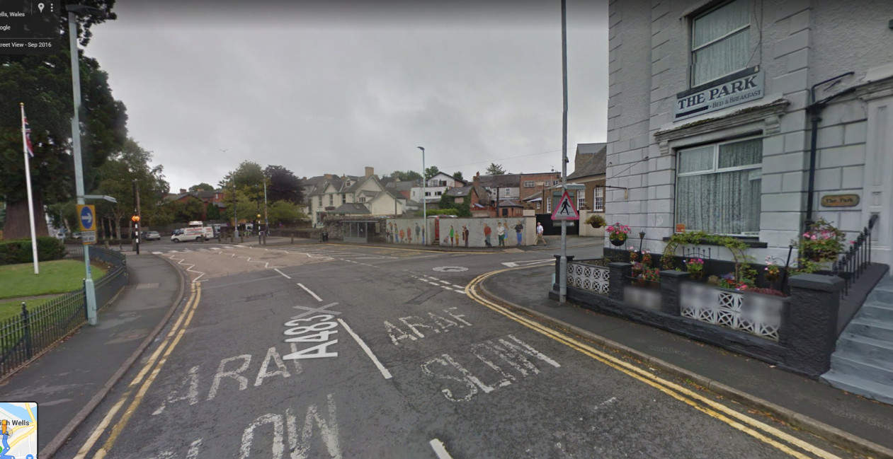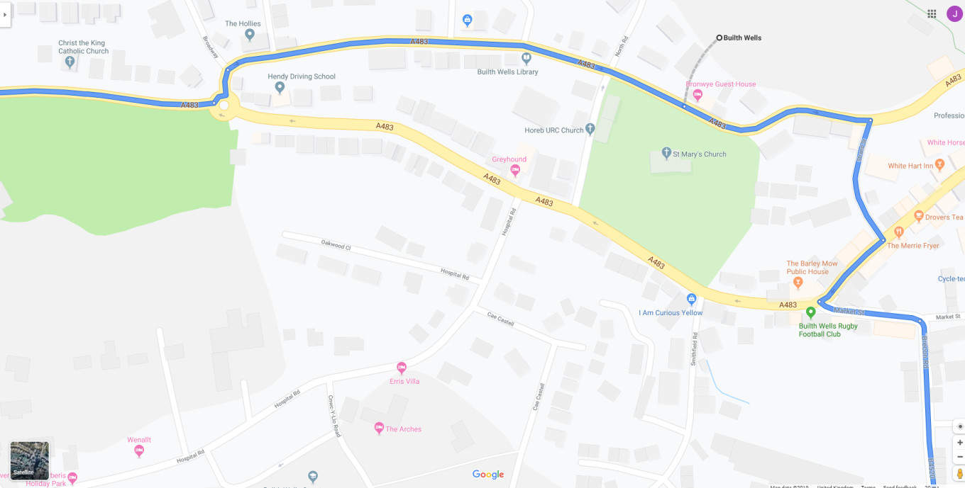 Follow the A483 into Builth Wells - blue route below (the short cut has a one way stretch and can't be used).